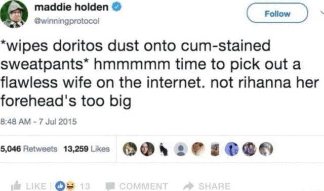 To make myself more clear: I want you to start your podcast. I want you to bootstrap your way into whatever you’re passionate about, to crowbar the door open and announce yourself with joy and confidence… but I want your passion. I don’t want ‘three bros in a room’ podcast energy from you any more than I want it from the men, and I don’t think it’s wrong to chase this idealism. We must acknowledge the difference in ‘I have a shitty mic and a dream’, where you’re driven by your vision and perspective and knowledge, and ‘let me tell you how to think, how to be more like me’. ‘Reconsider’ does not mean ‘stop’. ‘Reconsider’ means to learn more, to be ready and considered in your voice before starting, to understand who and what you are. I want you to have confidence in your ACTIONS not your inherent SELF – for your actions to reflect a self you feel neutral about or whose selfhood does not impose on others. We might get by without your podcast, but if you make something that isn’t generic, isn’t the same as everybody else’s product… that’s art, baby. That’s a fresh viewpoint we can choose to engage with, not the regurgitation of what you’re supposed to think.